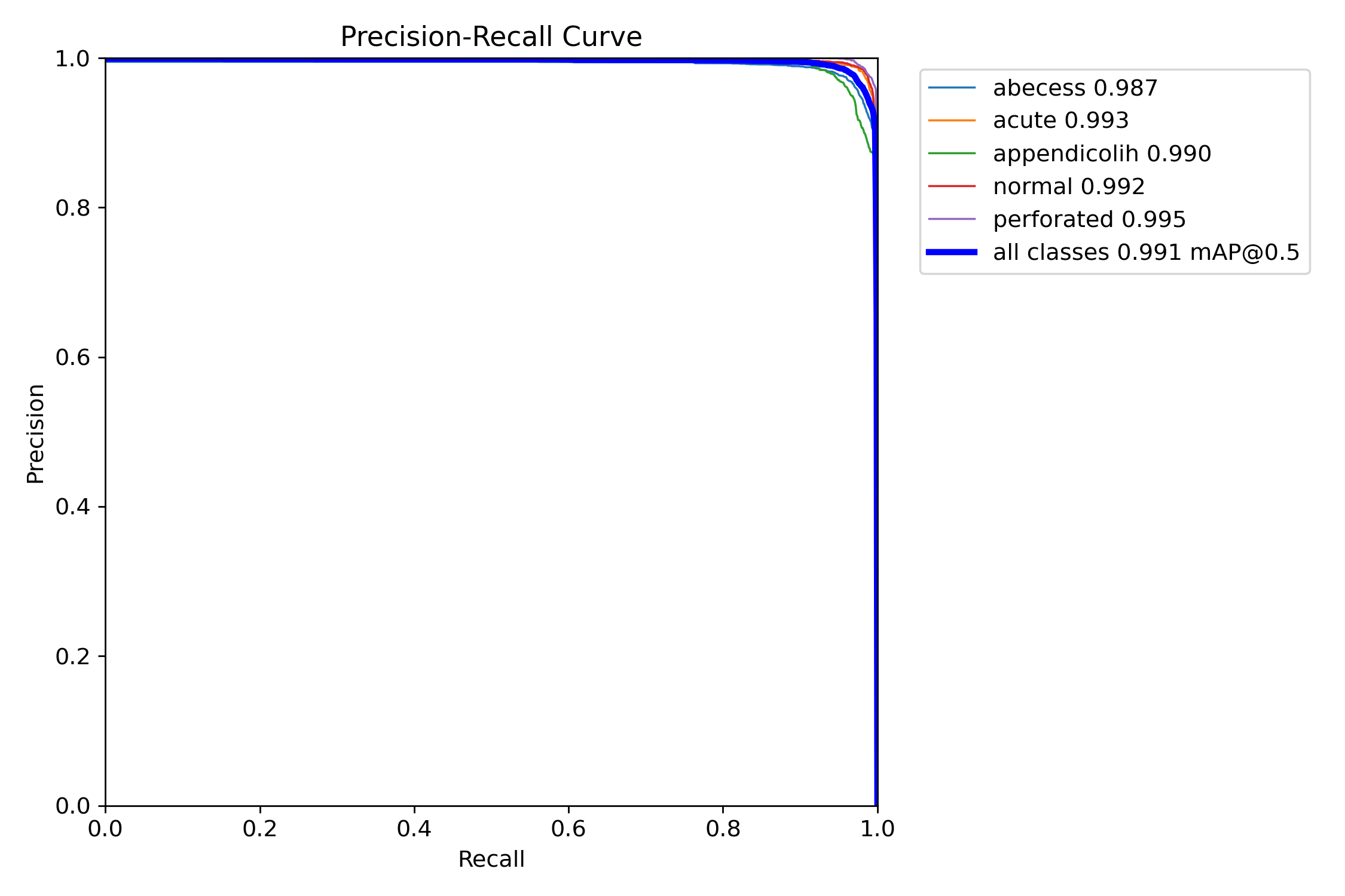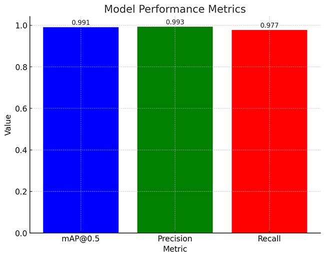 模型的关键性能评估指标mAP、Precision与Recall分别以蓝色、绿色和红色的形式标注出来。这些关键指标均呈现出较高的数值水平,并有效体现了该模型的整体性能优势。