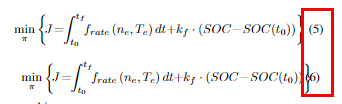 \min _{\pi} \left\{\! {J\! =\!\!\int_{{t_0}}^{{t_f}}\!\!{{f_{rate}}\left( {{n_{e}},{T_{e}}} \right)dt{\rm{ + }}{k_f} \cdot \left( {SOC \!-\! SOC({t_0})} \right)} } \right\}