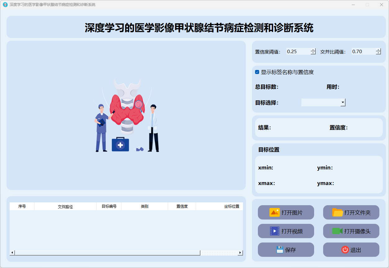 检测结果:系统连接摄像头进行实时分析,检测到甲状腺结节病症并显示检测结果。实时显示摄像头画面,并将检测到的行为位置标注在图像上,表格下方记录了每一帧中检测结果的详细信息。