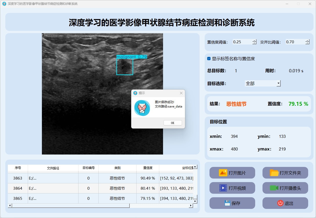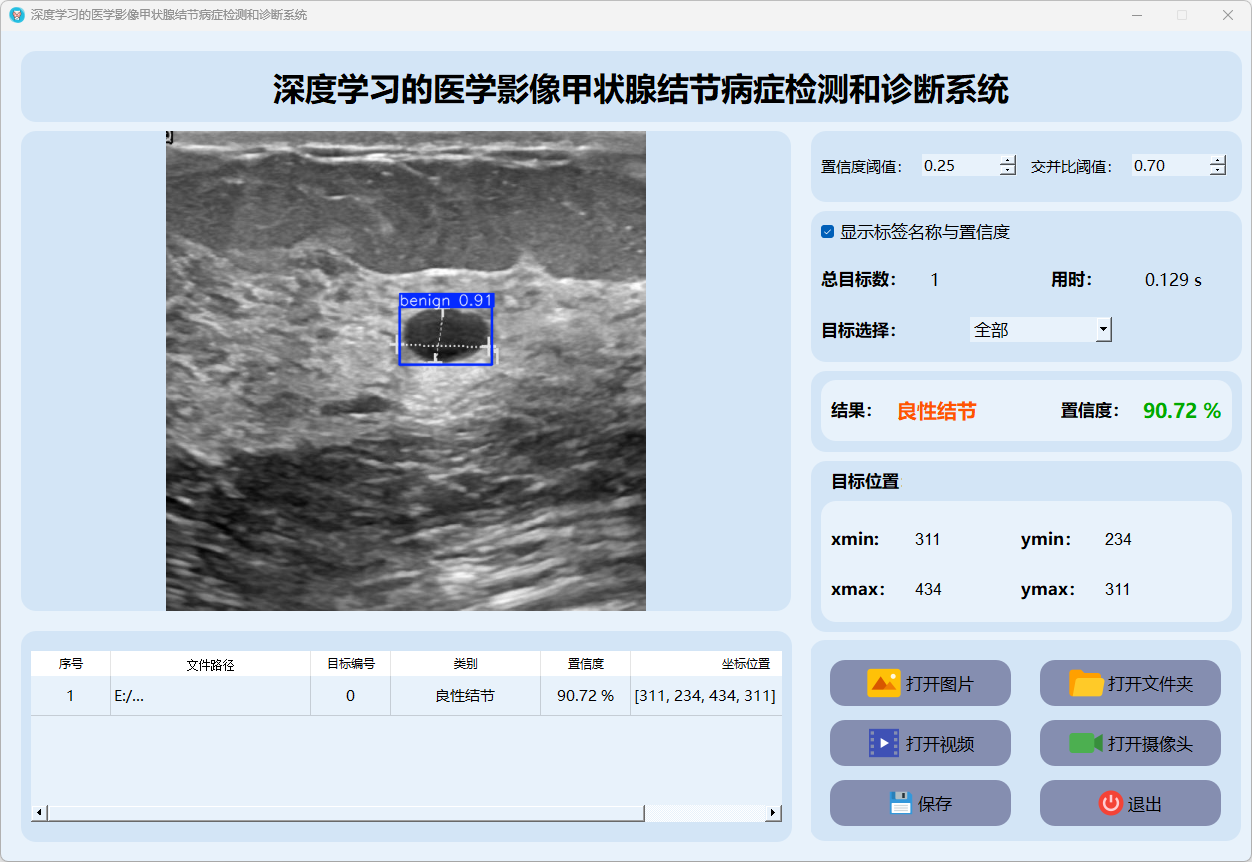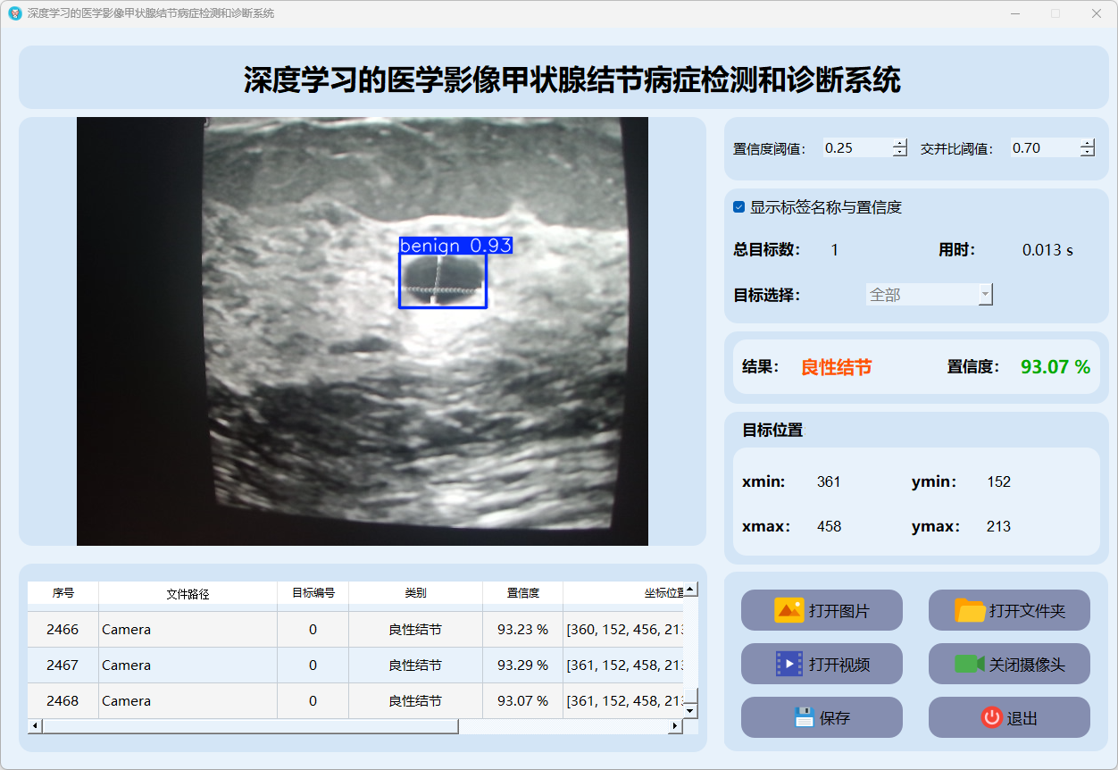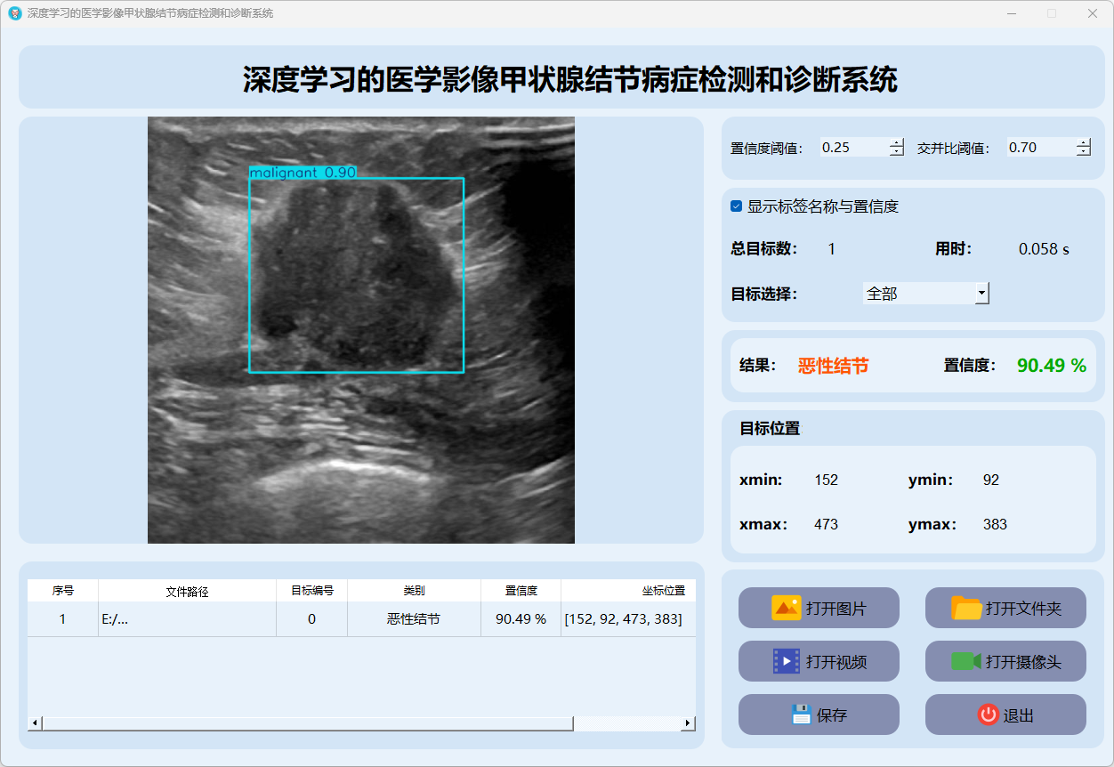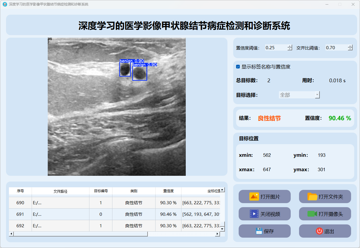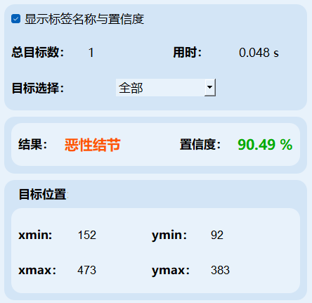 检测结果:系统识别出图片中的甲状腺结节病症,并显示检测结果,包括总目标数、用时、目标类型、置信度、以及目标的位置坐标信息。