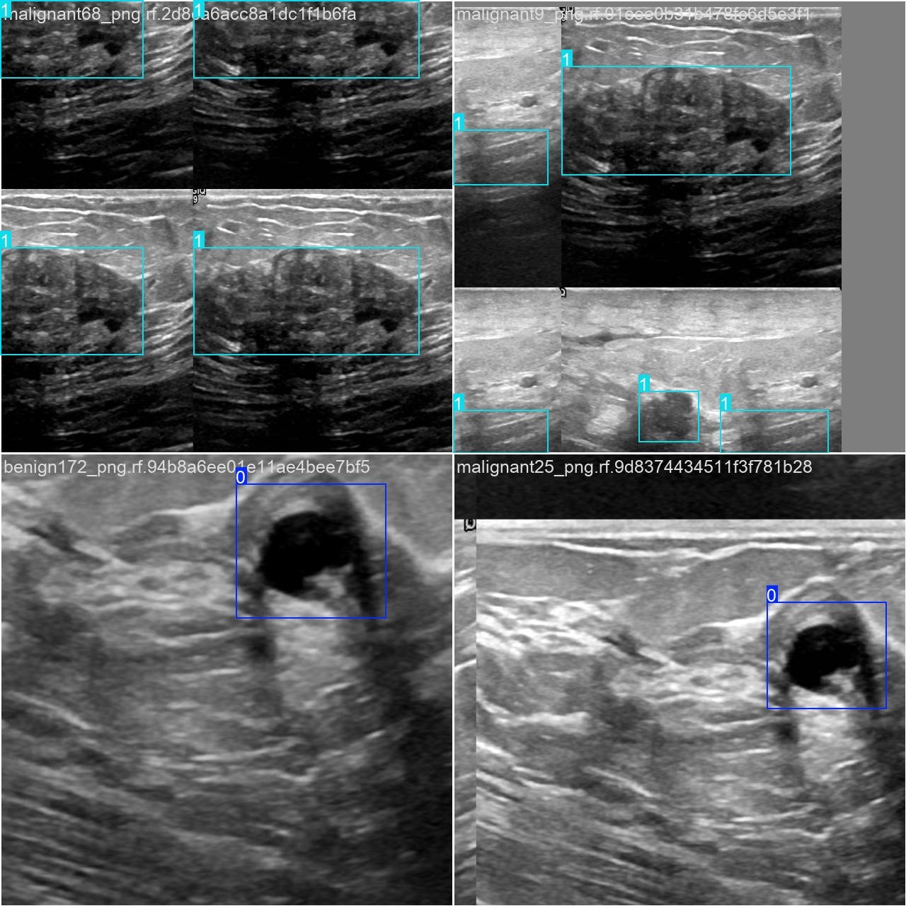 本研究使用了包含各种甲状腺结节病症相关图像的数据集,并通过Labelimg标注工具对每张图像中的目标边框(Bounding Box)及其类别进行标注。然后主要基于YOLOv8n这种模型进行模型的训练,训练完成后对模型在验证集上的表现进行全面的性能评估及对比分析。模型训练和评估流程基本一致,包括:数据集准备、模型训练、模型评估。本次标注的目标类别为甲状腺结节病症,数据集中共计包含1863张图像,其中训练集占1452张,验证集占411张。部分图像如下图所示: