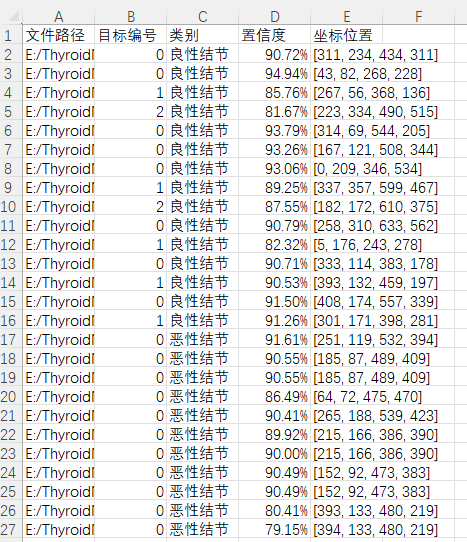 图片文件保存的csv文件内容如下,包括图片路径、目标在图片中的编号、目标类别、置信度、目标坐标位置。