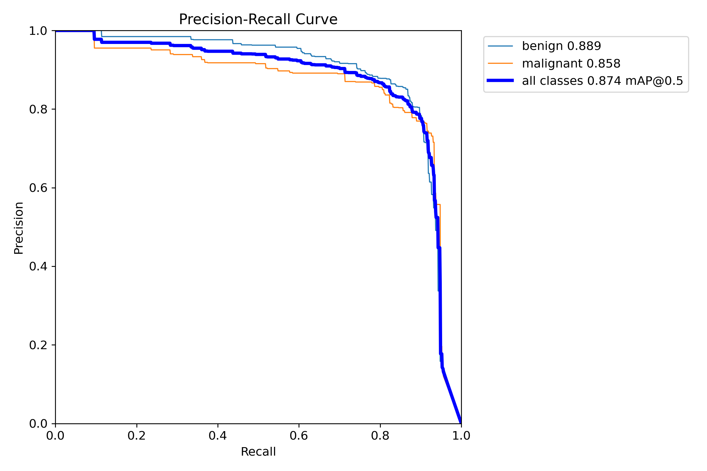 (1)benign(良性结节):边界框平均精度 (mAP@0.5) 为 0.889,综合平均精度 (mAP50-95) 为 0.674,表示模型在良性结节检测上表现非常好。