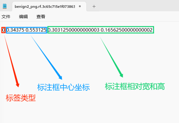 每一行代表标注的一个目标,通常包括五个数据,从左到右依次为:类别id、x_center、y_center、width、height。