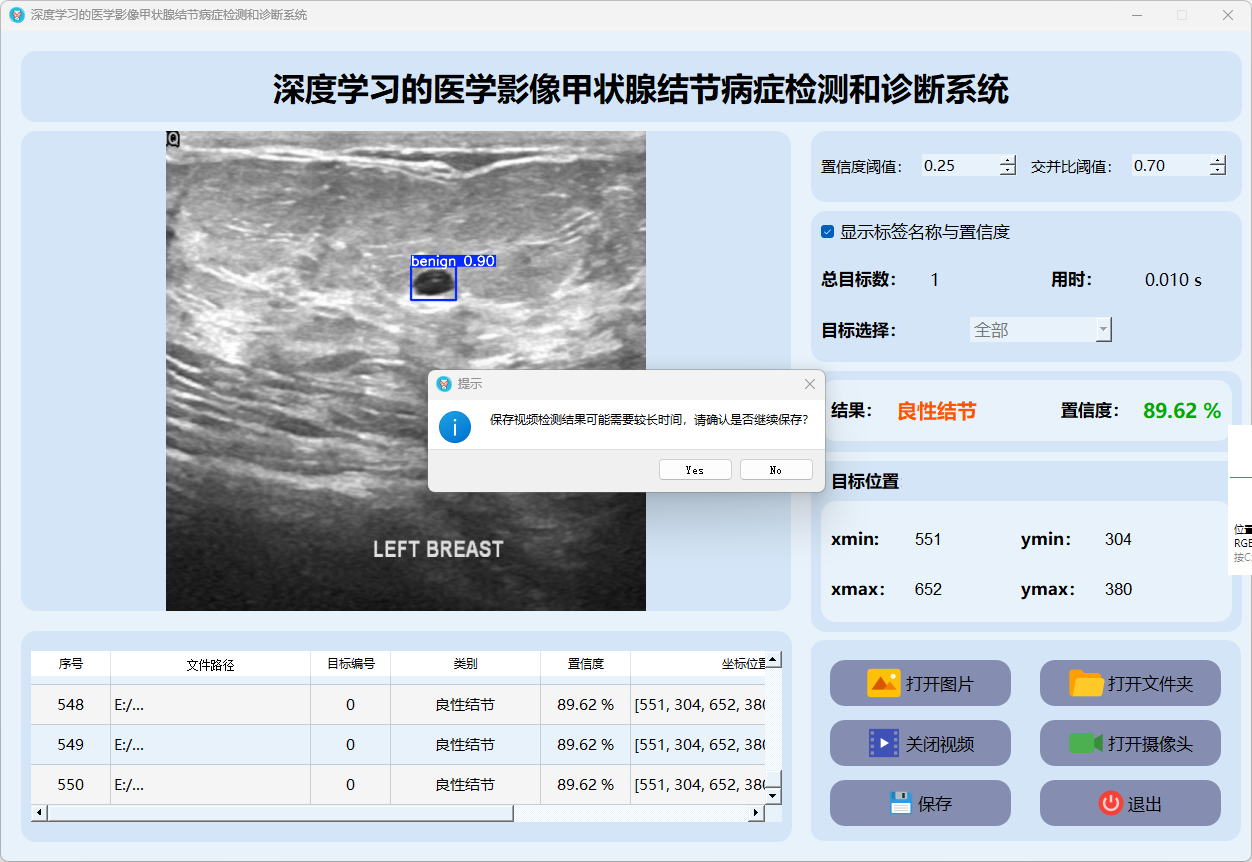 检测结果:系统对视频进行实时分析,检测到甲状腺结节病症并显示检测结果。表格显示了视频中多个检测结果的置信度和位置信息。