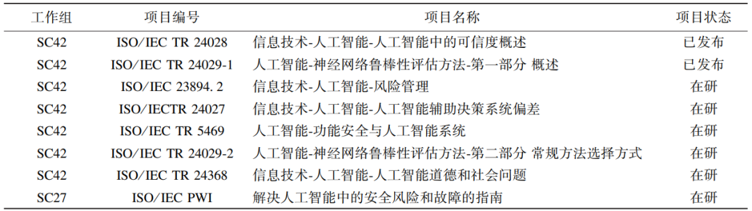 表1 ISO/IEC JTC1人工智能安全标准项目概况