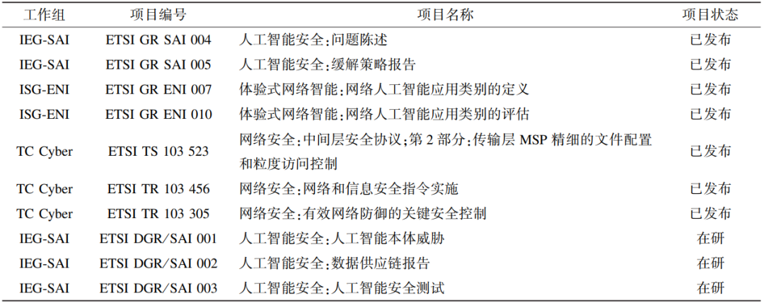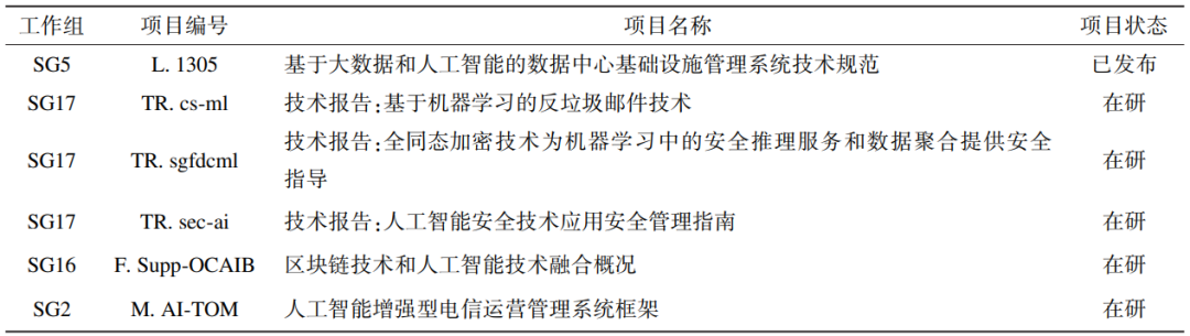 其人工智能工作则涵盖了多个专门化研究团队,在此框架下开展各项技术探讨与规范制定活动。这些专门化团队主要涵盖以下几大领域:其一是负责网络安全相关的技术研究;其二是致力于推动环境变化监测与适应技术的发展;其三是专注于多媒体通信技术和数据处理方法的研究;其四是负责探索业务运作模式及电信管理系统的技术优化路径等多方面内容。其中相关的人工智能安全标准项目可在表2中找到详细说明。