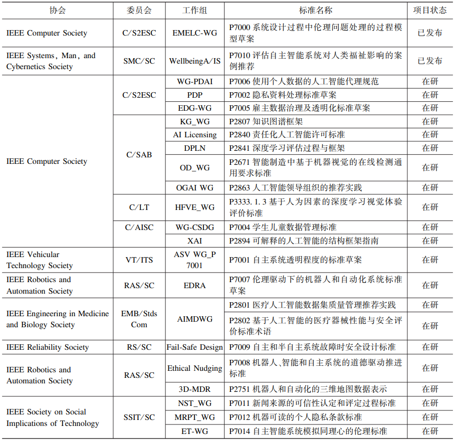IEEE专委会设立了人工智能系统(AIS)专业社区,并组织发布了包括全球人工智能系统人类福祉计划、人工智能系统应用风险与影响框架在内的多个倡议方案。在这些倡议的引导和支持下,在安全领域具有较大影响力的标准化工作组主要负责制定包括IEEE P7000TM系列和P2247TM系列在内的标准文件。其中P7000TM系列被视为人工智能领域伦理规范的重要参考标准,在该领域长期受到研究人员的关注;而P2247TM系列则聚焦于深度学习与机器学习技术开发的技术评估指南,在医疗行业应用中提供了相应的安全指导,在工业及金融等领域则为各类应用场景的人工智能应用与产品提供相应的安全指导原则。 IEEE计算机学会下属的人工智能标准化委员会(C/SAB)以及软件与系统工程委员会(C/S2ESC)则致力于推动各设计阶段的伦理规范制定工作,并重点涵盖了人机交互系统的透明度问题以及算法潜在偏差的影响评估研究;此外还需对数据隐私保护机制进行深入探讨,并在此基础上完善知识图谱构建的相关技术标准体系。未来工作重点将包括自动驾驶技术的安全规范以及智能城市和工业领域的人工智能安全标准建设