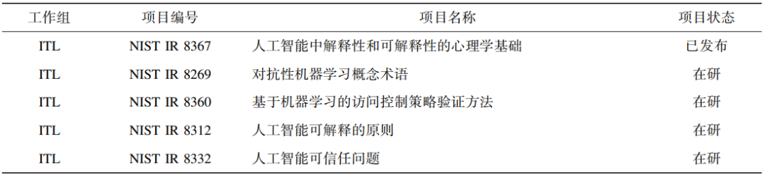 美国国家标准与技术研究院(NIST)将人工智能列为关键标准领域,并于2019年2月发布《推动美国在人工智能方面保持领先地位的行政命令》(EO13859)。该命令旨在要求联邦机构加强协调合作,在促进AI系统可信度的同时提升相关知识及领导力水平。作为这一领域的核心机构之一,NIST设立了信息科技实验室(Information Technology Laboratory, ITL),其主要职责是研究并发展符合社会及伦理考量的人工智能系统,涵盖AI系统的安全性、技术治理以及隐私保护等多个方面。表5列出了NIST涉及的人工智能安全相关标准项目。此外,在2020年,NIST发布了隐私框架路线图,并提出了应进一步关注AI隐私安全的问题