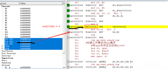 SWI地址 = LR返回地址 - 4