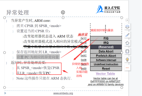 - 根据异常向量表,PC 指向相应异常向量