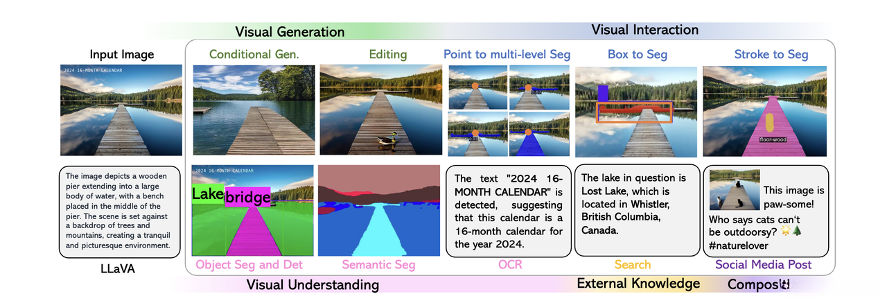 LLaVA-Plus具备多种功能。它不仅能够执行基础的图像编辑任务如物体检测、分割与标注等操作,并且还支持复杂的OCR处理以及图像美化功能。此外,LLaVA-Plus能够实现外部知识交互,在线互动方面也表现出色:例如,在用户点击特定区域时系统会自动执行实例分割操作以提供精准服务。