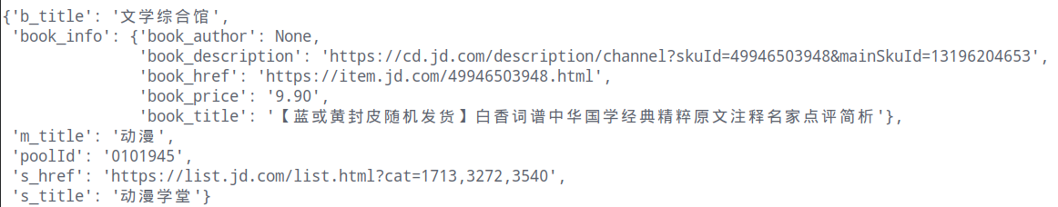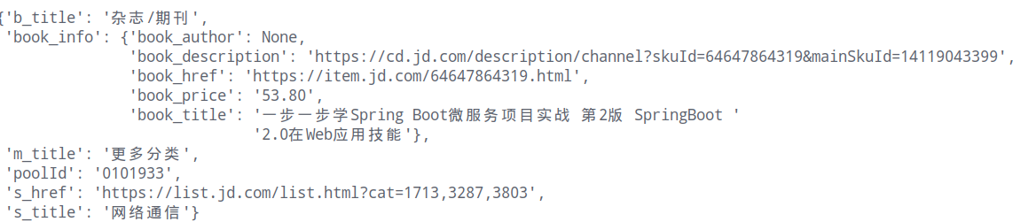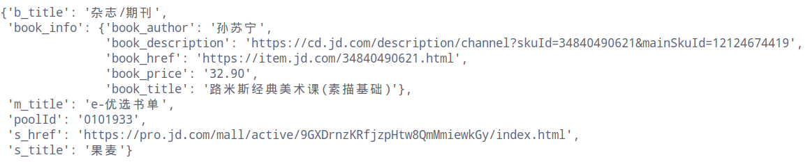 返回的数据是Json大分类:https://lapi.jd.com/pool?body={%22pid%22:%220101947%22}&source=book,每个poolid对应一个大title ``` title: "文学综合馆", operate_title: "", sort_num: 2, fid: 0, id: 7369, ext_info: { poolId: "0101945" } ``` 部分数据,即title对应一个poolId,属于同一个字典下拿到大分类的poolId,就可以用pooId取构造请求:https://lapi.jd.com/pool?body={%22pid%22:%220101945%22}&source=book,来获取中title以及小title,以及对应的小title的url请求小title的url拿到图书列表,图书信息在https://list.jd.com/listNew.php?cat=1713%2C3260%2C3345&page=150,在这个地址中,有总的页数,SEARCH.adv_param={page:"150",page_count:"200",psort:"0",cid1: 0,其中page_count为总的页数,page为当前页数,价格未有单独请求,包含在这个网址中,至此,网页分析完毕。