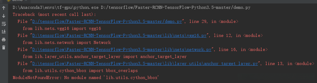 从GitHub上获取了安装了Python 3.5版本的Faster RCNN模型,在不进行任何修改的情况下,请先执行一遍demo.py。常见的第一个错误如图所示。