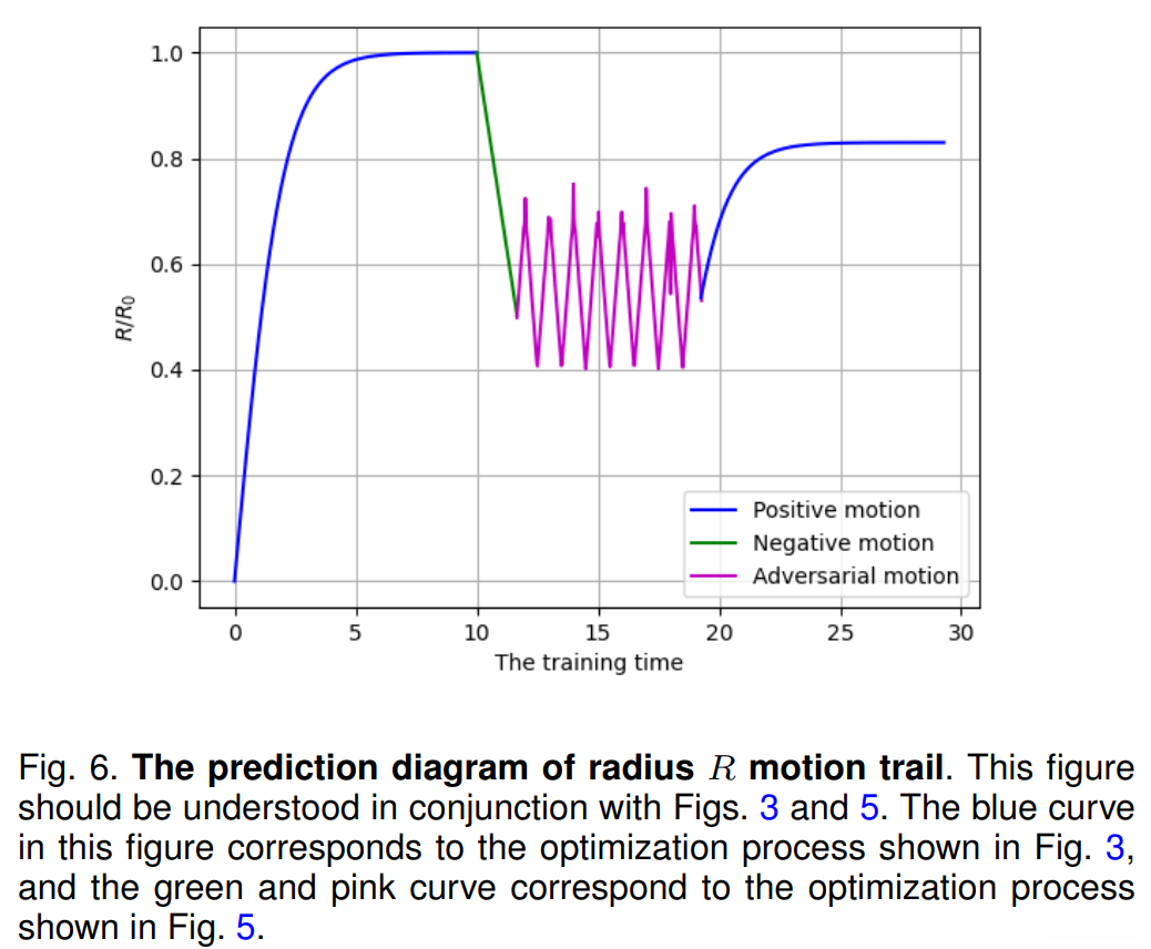 本小节对实际训练过程中半径R的运动轨迹进行了详细讨论。由于MPF模型中半径R的运动已被AMPF包含在内,而AMPF++模型中半径R的运动与AMPF的运动没有本质的区别,本小节只讨论AMPF模型中半径R的运动。