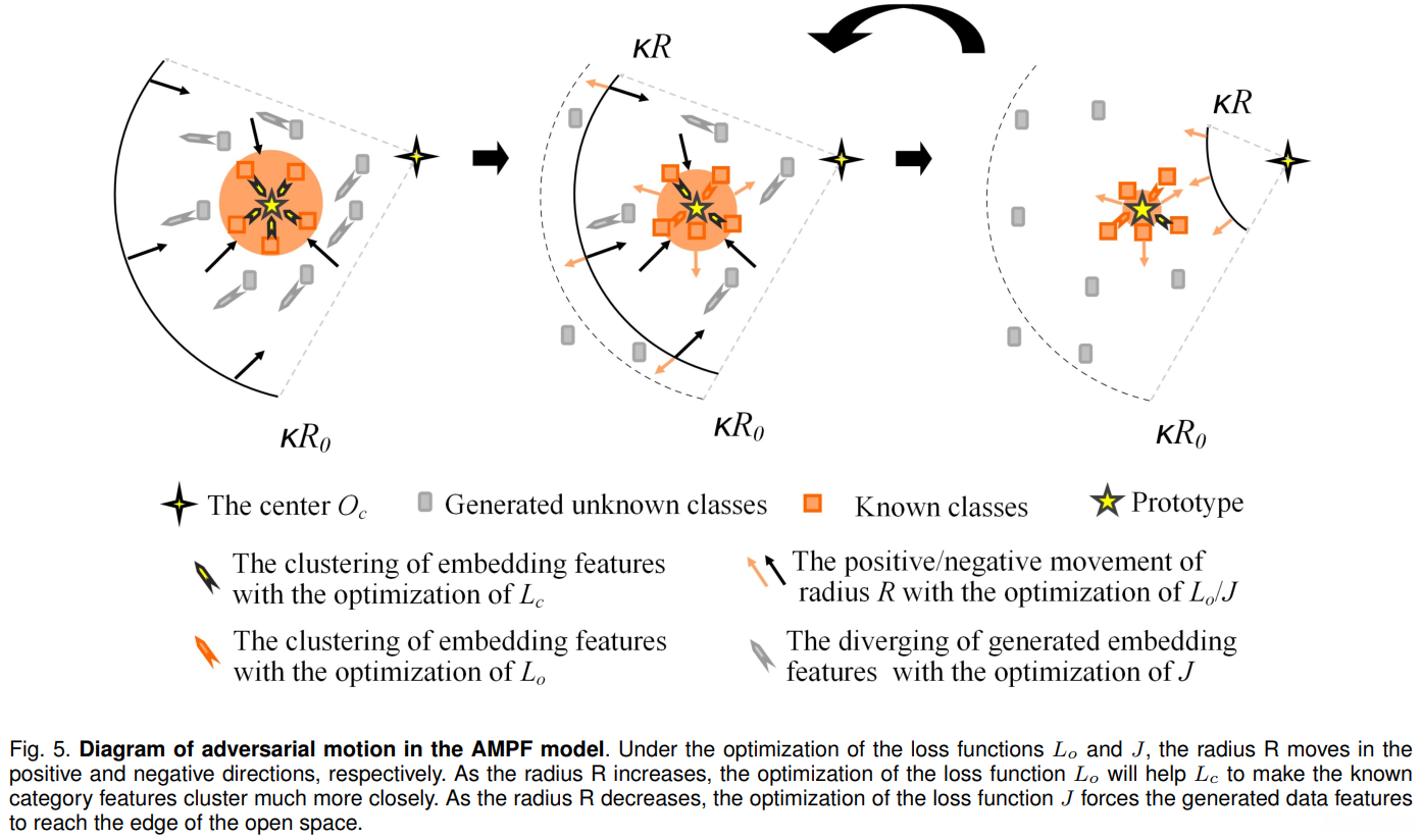 当在测试阶段面对无穷无尽的未知类时,仅根据有限的已知类来降低开放空间风险显然是不够的。因此,许多研究产生未知类数据并将其加入训练阶段,以进一步降低开放空间风险[5], [9], [10], [11], [12]。考虑到这个想法,在MPF的基础上提出了一个 "对抗性运动 "属性模型,即对抗性运动原型框架(AMPF)。结合训练阶段的已知类数据和生成的数据,该模型通过边际约束半径的对抗性运动迫使未知类特征远离已知类。此外,还提出了AMPF模型的增强版,即AMPF++,该模型可以在训练阶段加入开放空间中更多区域的生成的未知类数据,以进一步提高OSR性能。