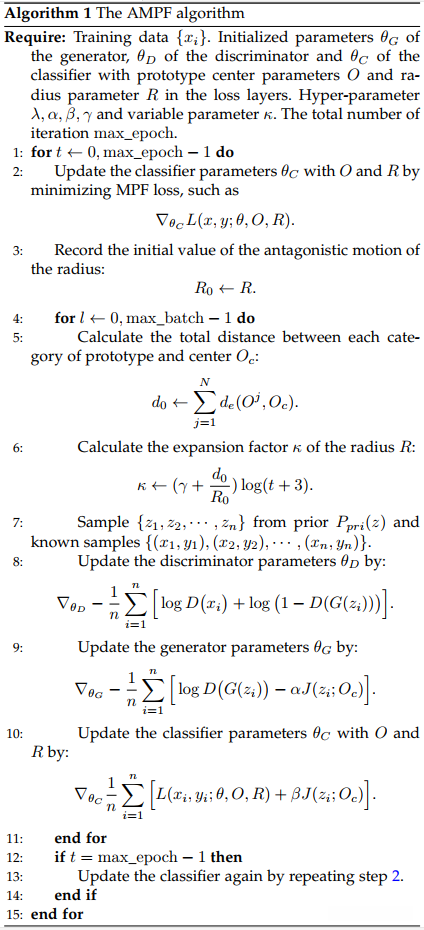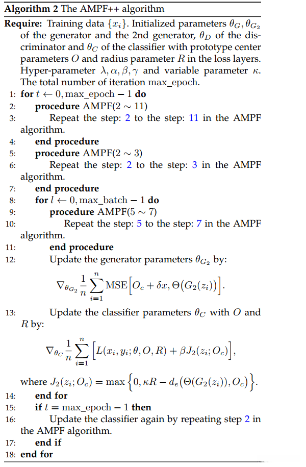 最后,AMPF++模型的算法如图2所示。在每个迭代内,首先运行AMPF算法;然后,运行MPF算法,使进入 "正向运动 "的半径R增加到R0;最后,开始与生成器G2结合的对抗运动。 按照Alg.2训练网络模型后,测试集中x属于已知类别的概率可以通过以下公式确定。