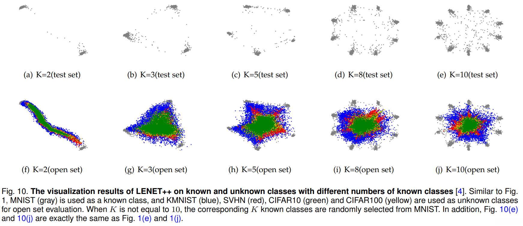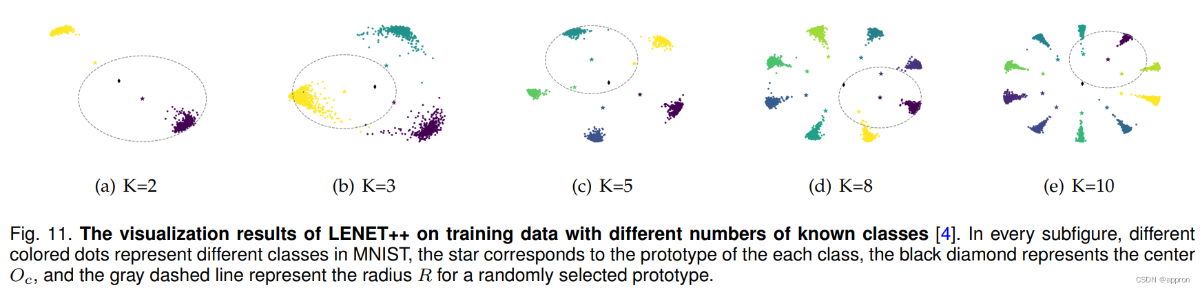 当经典的深度神经网络解决经验风险时,一个全连接层被连接到网络的末端进行分类,并使用softmax来训练网络。如图1(a)所示,特征空间将被超平面划分为几个半开放空间,已知类别的特征将被强制落入相应的半开放空间。虽然由softmax训练的网络可以有效地对MNIST进行分类,但图1(f)证明了这个网络无法避免已知类和未知类之间的嵌入特征的重叠。