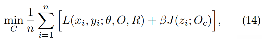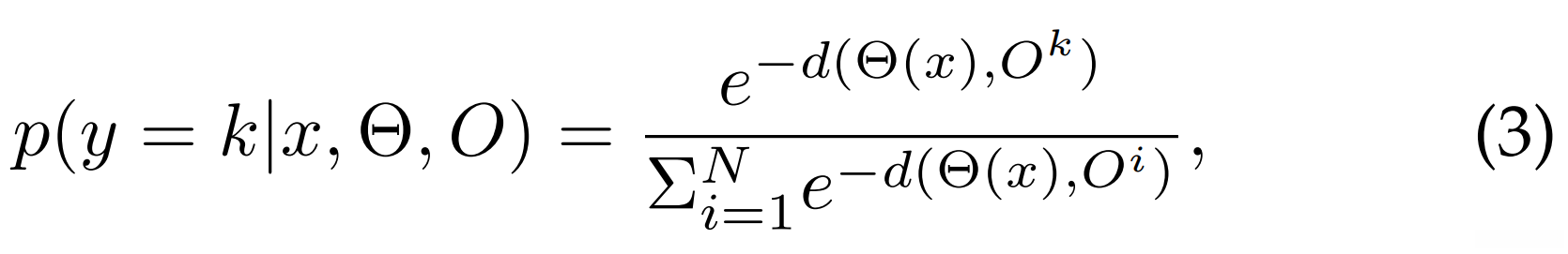 其中Θ是原始数据x的嵌入函数,d(Θ(x); Ok)是Θ(x)和Ok之间的距离。为了保证N个原型中心的分布不会太分散,N个原型中心是由高斯分布随机初始化的。嵌入的特征应该更接近于相应的原型中心,这被作为训练网络的标准。其损失函数可以表示为