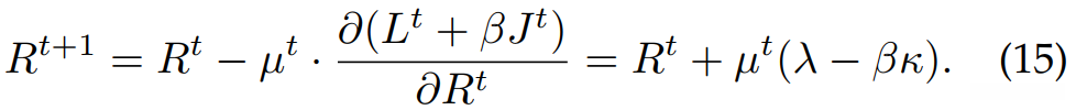 当分类器C按照负梯度方向优化时,半径R也是 "移动 "的,其运动公式如下。