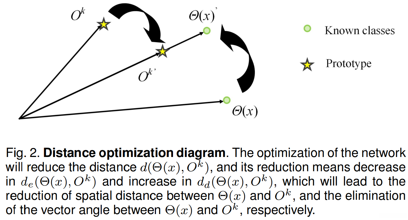 其中m是Θ(x)和Ok的尺寸。当网络被优化时,Θ(x)和Ok将被调整,如图2所示。只有当向量Θ(x)和Ok近似于一条直线,且Θ(x)和Ok非常接近时,Lc(x; θ; O)的优化才会接近收敛。 这种距离设置可以确保类别集群尽可能向外分布,可以减少开放空间。
