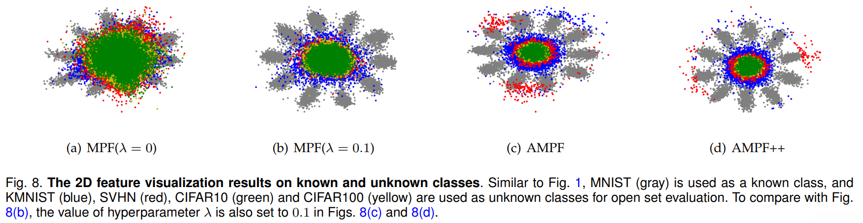 如图8(c)和8(d)所示,一些KMNIST和SVHN数据被认为与已知类相似,它们被映射到已知类的周围,这就是AMPF和AMPF++引入的对抗性优化策略。此外,未知类的嵌入特征在开放空间中心的小范围内被有效抑制,这对降低开放空间风险也很有意义。可能是CIFAR10和CIFAR100与已知类MNIST的相似度不高,因此,这两个类别的数据很少被映射到周边地区。
