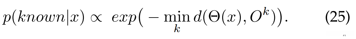有些研究为每个聚类设置多个原型[8],[29],这使得聚类在特征空间的分布不够紧密,从而增加了开放空间的风险。因此,本文对某一聚类只设置一个原型中心,即原型中心O = fOk; k = 1; 2; - -; Ng。对于任何原始数据x,其标签y属于k类的概率可以通过以下公式计算。