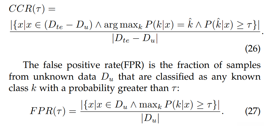为方便起见,本文引入了一个独立于工作阈值的开放集分类率(OSCR)指标来代替F1度量[4]。设τ是一个分数阈值。正确分类率(CCR)是正确类别k具有最大概率且概率大于τ的样本的一部分。