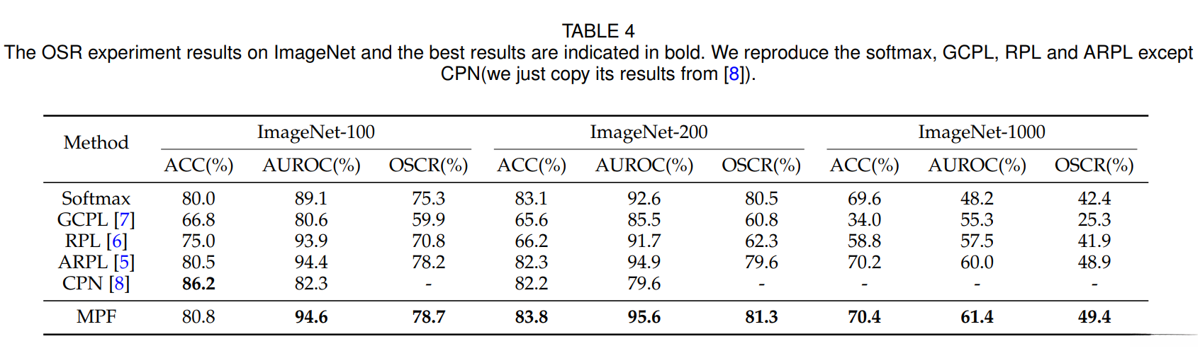 表2和表3显示,当测试数据集不大时,MPF的性能并不优于ARPL。2和3显示,当测试数据集不大时,MPF的性能并不比ARPL好多少。然而,如表4所示,在所有三个实验中,MPF的性能都高于ARPL。4所示,在所有三个实验中,MPF的性能都高于ARPL的性能。此外,MPF比传统的softmax和其他一些方法(除了在ImageNet-100中的CPN)表现得更好,这表明所提出的方法在更大规模的数据集上具有良好的可扩展性。