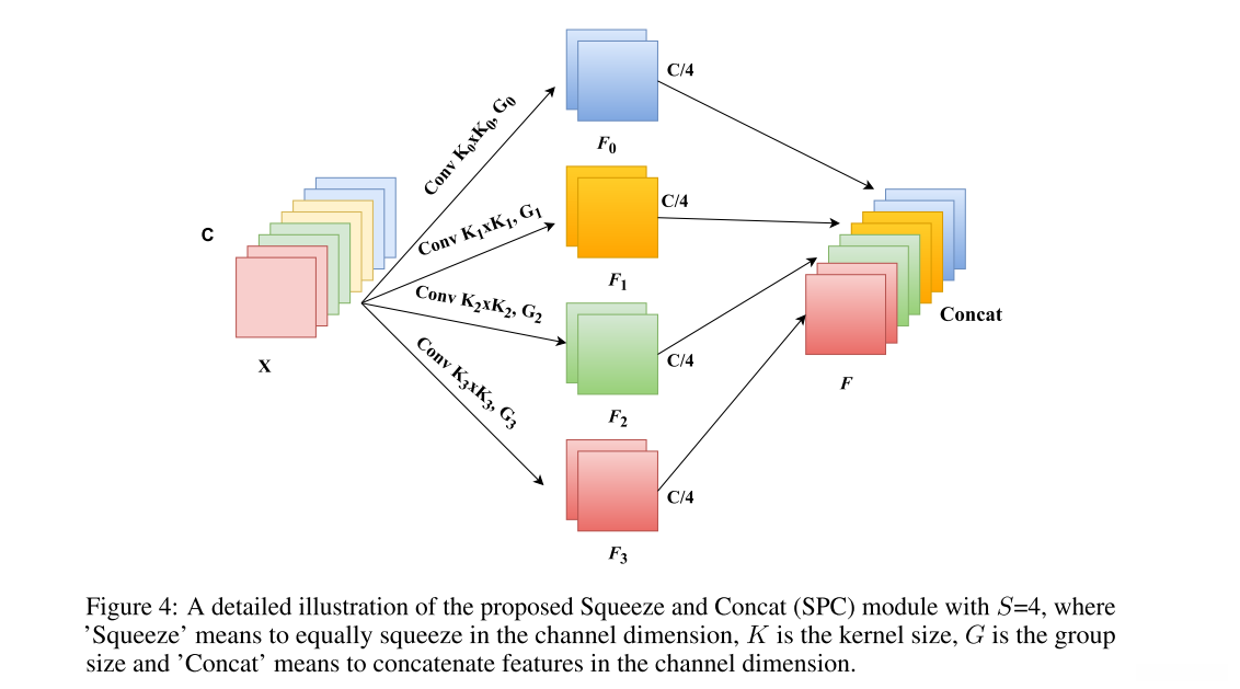 如图4所示,在所提出的PSA架构中实现了多尺度特征提取的关键组件为SPC。我们采用了多支路设计来提取输入特征图的空间信息,并设定每支路的输入通道数为C。每个支路能够独立学习不同尺度的空间表示,并通过本地机制构建跨支路交互关系。值得注意的是,在内核尺寸扩大时会带来大量参数量的增长。为此,提出了一种群卷积机制。通过引入一种群卷积方法,则可以有效缓解这一挑战问题并提升模型性能。此外还设计了一种新的优化准则用于调节组尺寸的选择过程以进一步提高模型效率和准确性。