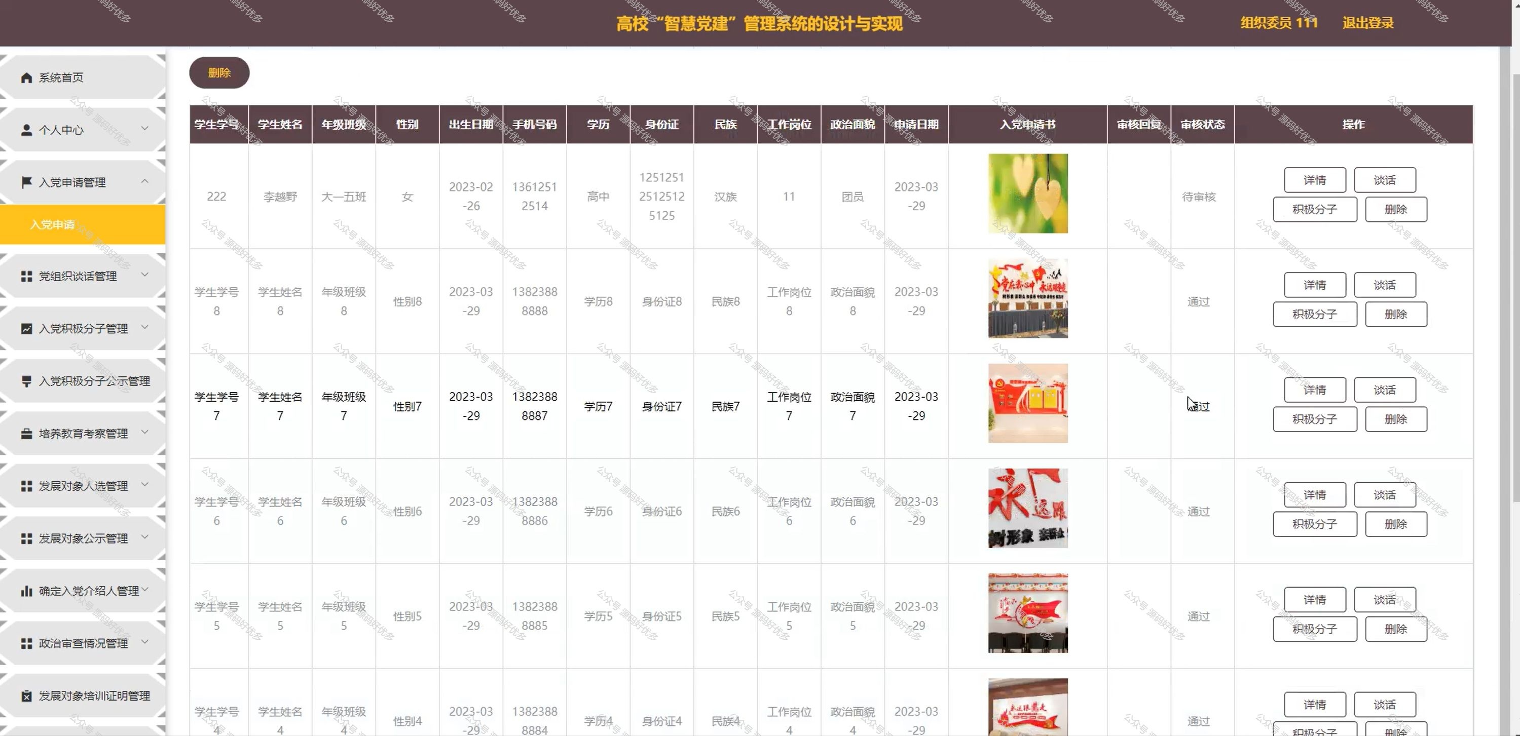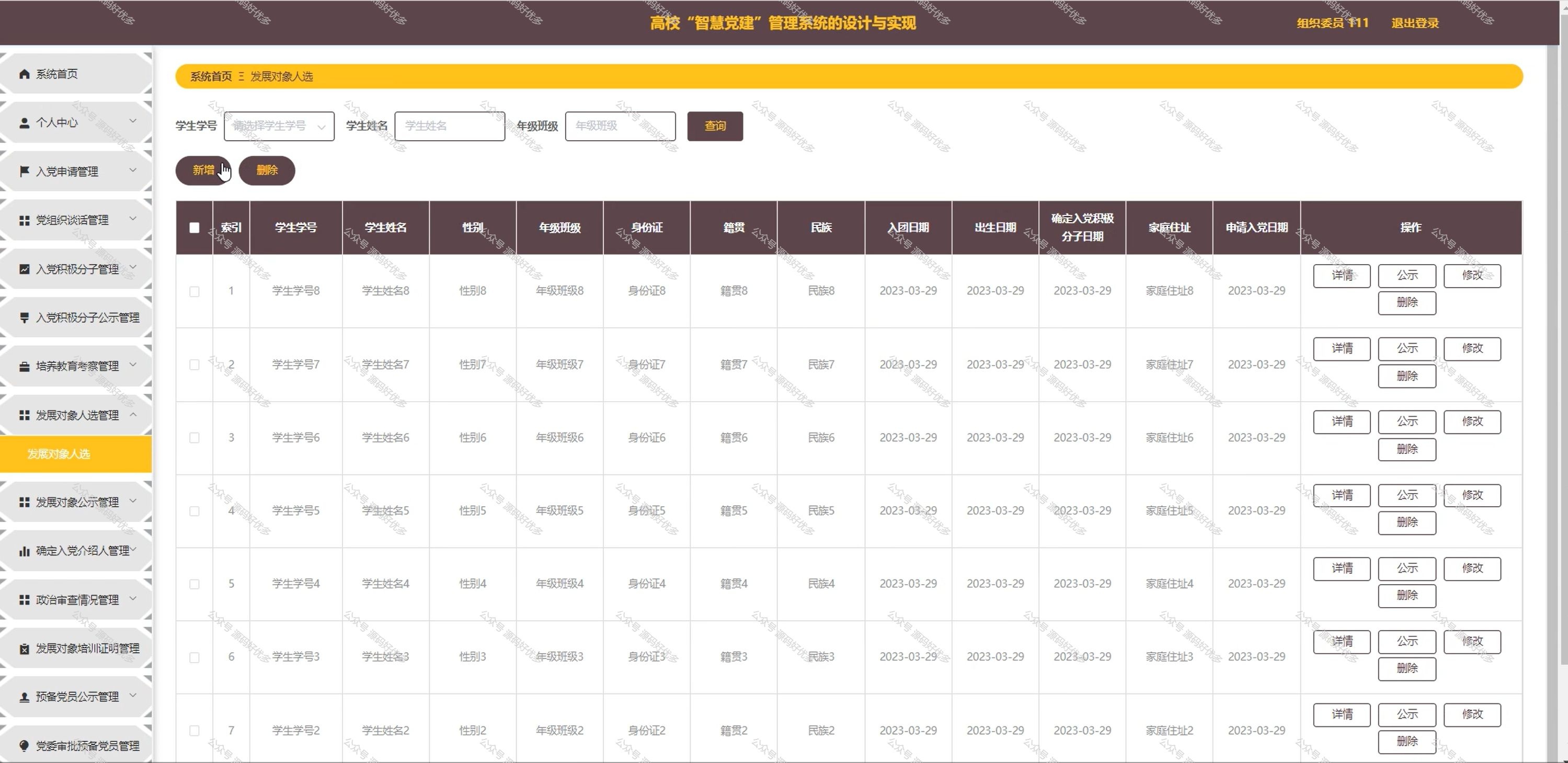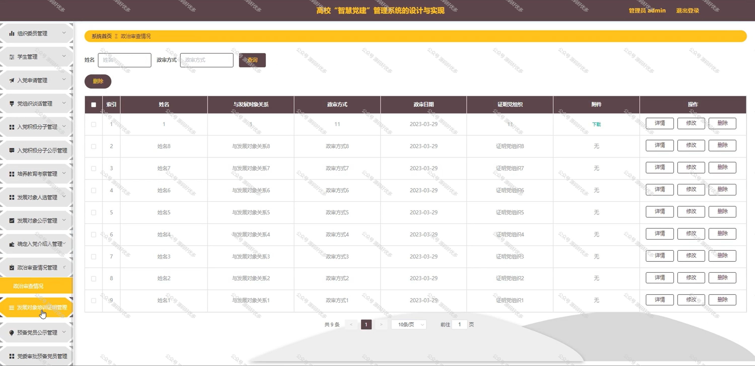 管理员具备一些核心功能:包括首页展示与操作功能(如个人中心)、组织委员相关的事务处理(如会议安排)、学生日常信息管理和培养工作(如班级统计)、入党申请人材料归档与审核流程(如电子档案存档)、党组织谈心谈话的相关事务处理(如定期交流)、对入党积极分子进行全面考察与评估(如思想动态分析)、及其公示信息发布工作(如结果公告发布)、确定 implode 入党介绍人的具体流程(如推荐标准制定)、政治审查记录维护(如背景调查存档)以及对预备党员的事前及事中审核流程(如考察档案存档)等多方面的职责与操作权限。