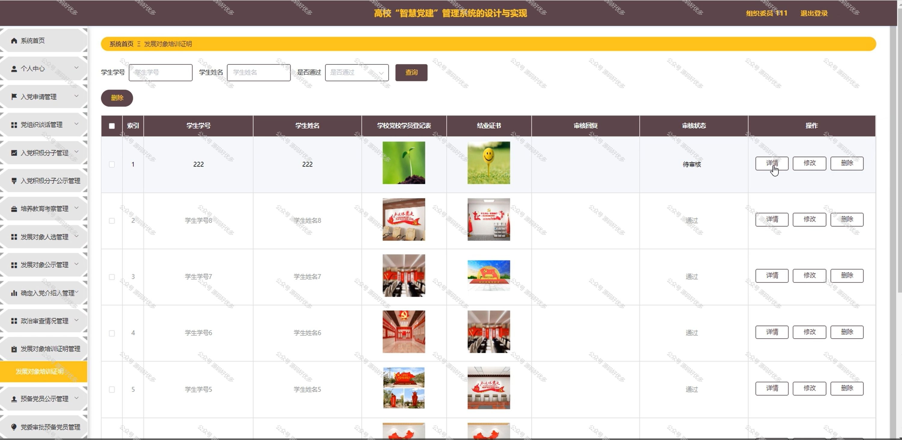 组织委员的功能:包含首页模块(系统首页)、个人中心模块(个人中心)、党员申请审核流程(入党申请管理和党组织谈话管理)、发展对象培养档案(入党积极分子管理和入党积极分子公示管理)、谈心谈话记录模块(党组织谈话管理和党内民主监督)、考察结果归档记录(培养教育考察管理和发展对象人选管理)、审查结果存档模块(政治审查情况管理和预备党员公示)、培训证明存档记录(发展对象培训证明管理和预备党员审批)