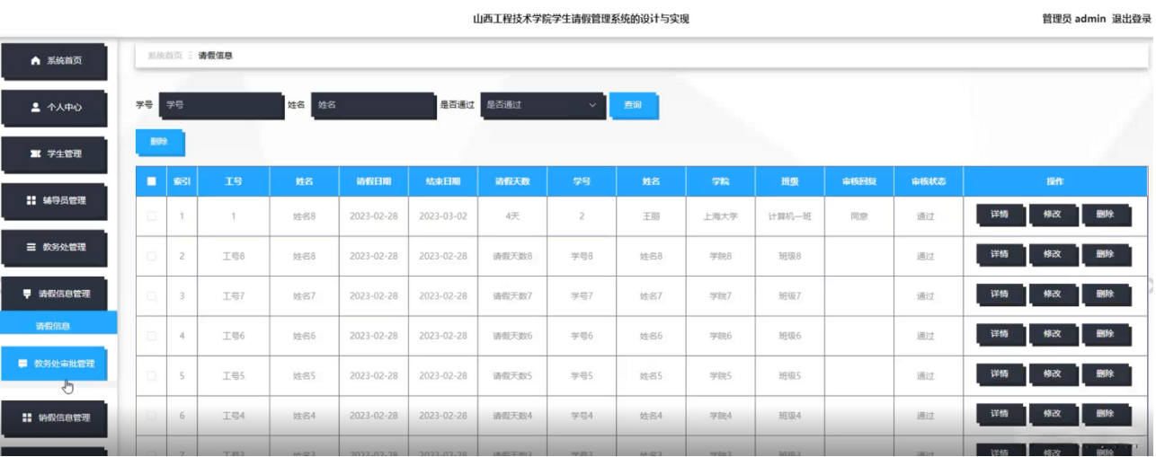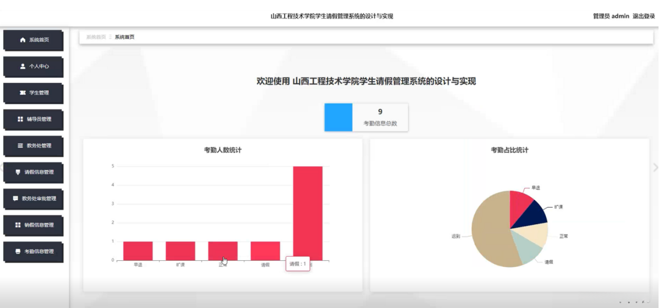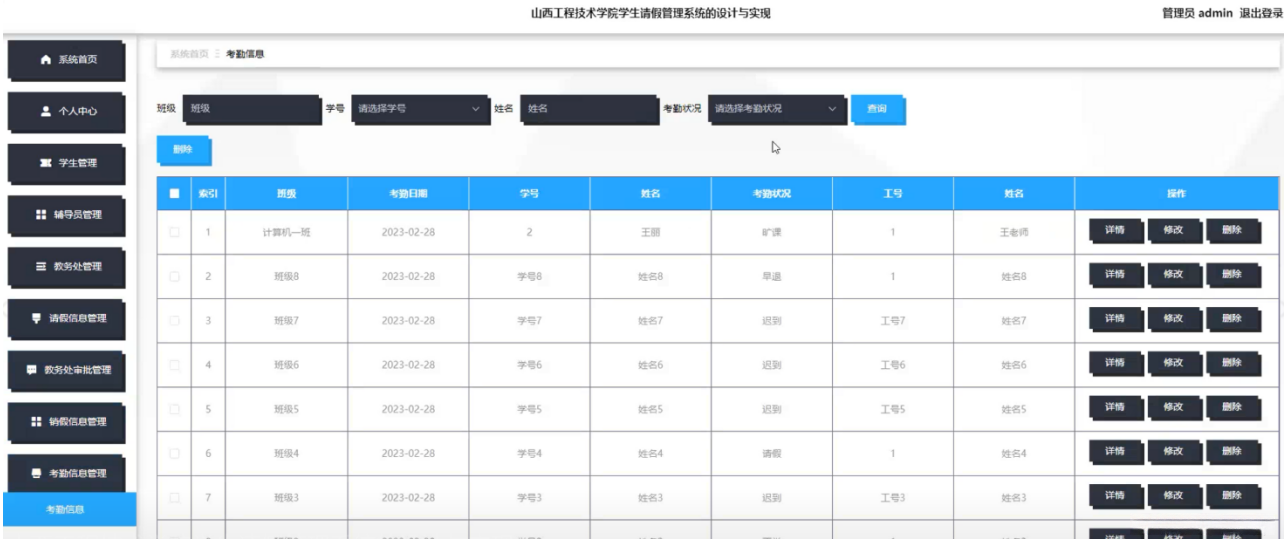 管理员登录进入系统可以查看系统首页、个人中心、学生管理、辅导员管理、教务处管理、请假信息管理、教务处审批管理、销假信息管理、考勤信息管理等功能,进行详细操作,如图5-2所示。