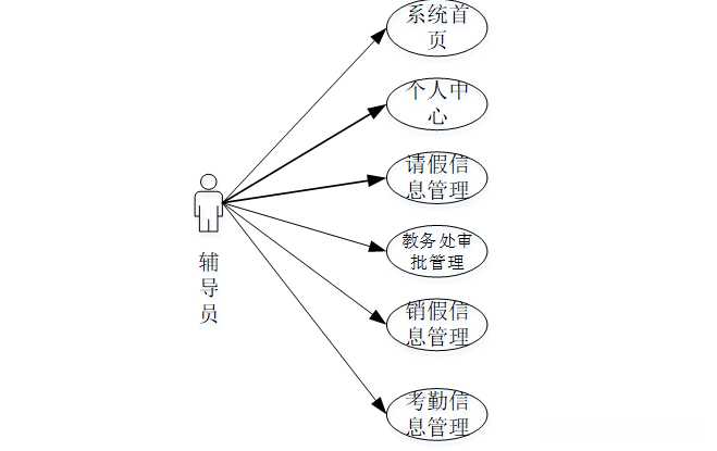 主要使用者为辅导员。具备有:系统首页、个人中心、请假信息管理、教务处审批管理、销假信息管理、考勤信息管理的功能。辅导员用例图如图3-2所示。
