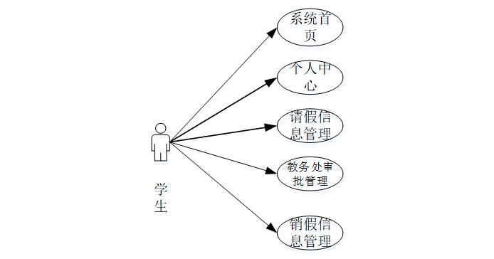 主要使用者为学生。具备有:系统首页、个人中心、请假信息管理、教务处审批管理、销假信息管理的功能。学生用例图如图3-1所示。