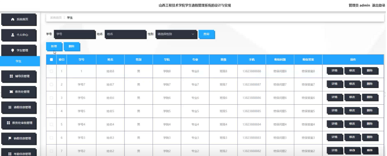 管理员点击学生管理;在用户管理页面输入学号、姓名、性别、学院、专业、班级、手机、密保问题、密保答案等信息,进行查询,新增或删除学生信息等操作;如图5-3所示。