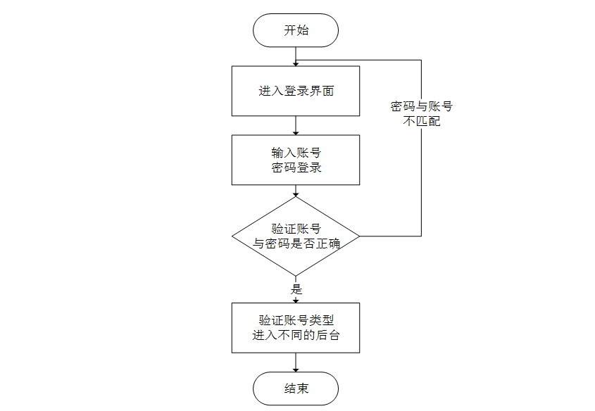 登录流程是该系统的第一个流程,登录的第一步是输入账号、密码登录,系统会验证账号与密码是否正确,正确时系统会判断账号类型再进入不同的后台;不正确时,会返回到登录的第一步,输入用户重新执行登录流程。该流程如图3-5所示。
