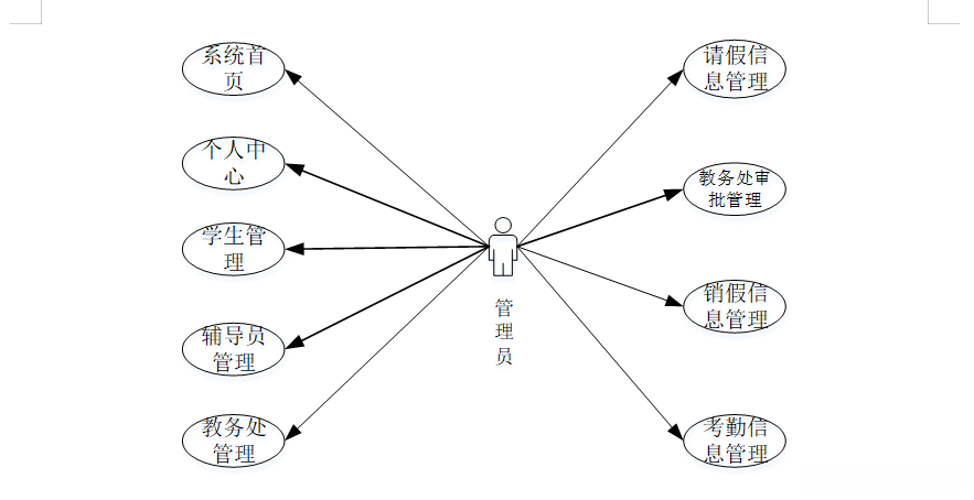 进行维护,以及平台的后台管理工作都依靠管理员,其可以对信息进行管理。需具备功能有系统首页、个人中心、学生管理、辅导员管理、教务处管理、请假信息管理、教务处审批管理、销假信息管理、考勤信息管理。管理员用例图如图3-4所示。