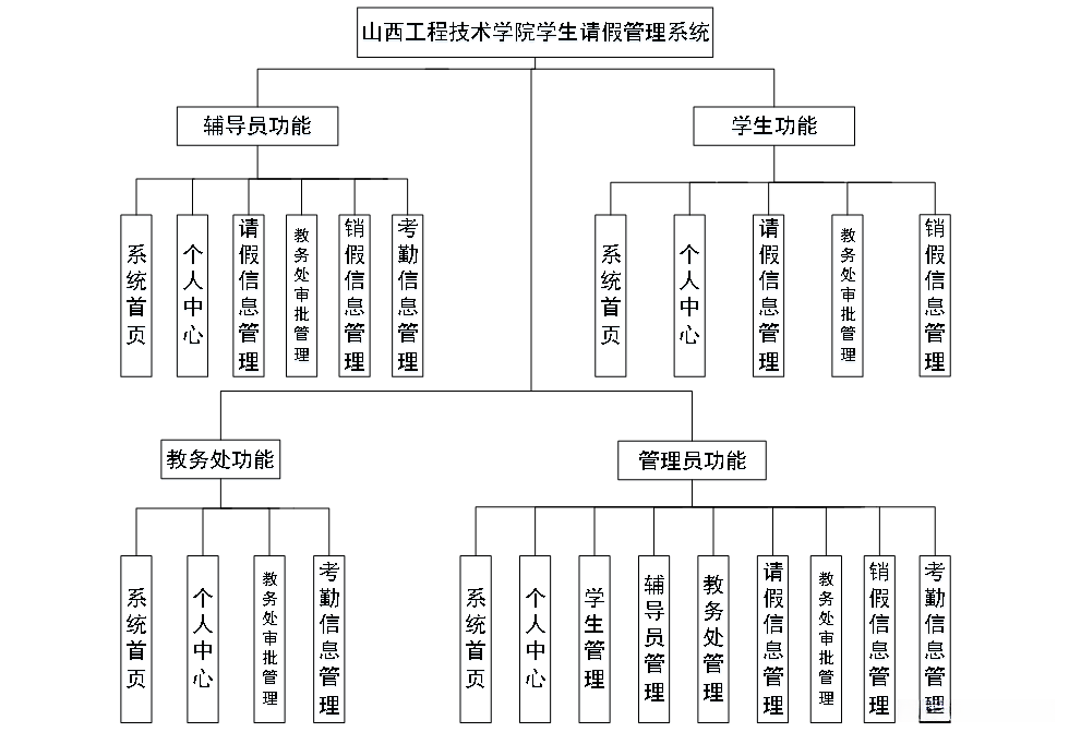 该章节的功能模块设计,只是大概描述了系统的所有功能模块,将功能按权限来讲解。系统总体结构图如图4-1所示。