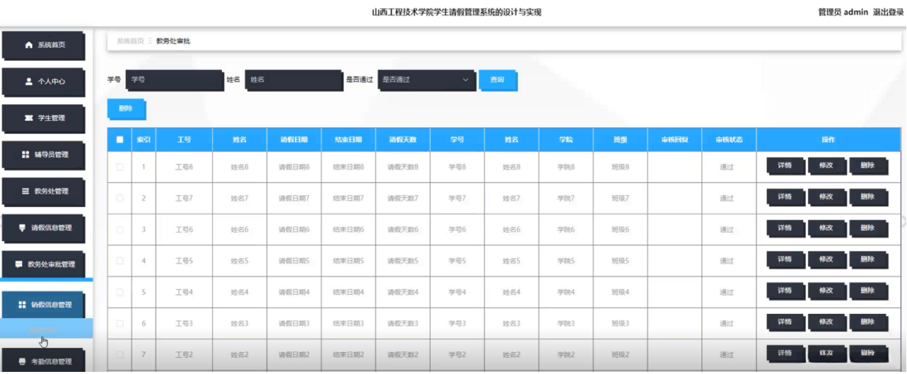 管理员点击教务处审批管理;在教务处审批管理页面输入工号、姓名、请假日期、结束日期、请假天数、学号、姓名、学院、班级、审核回复、审核状态等信息,进行查询或删除教务处审批等操作;如图5-6所示。