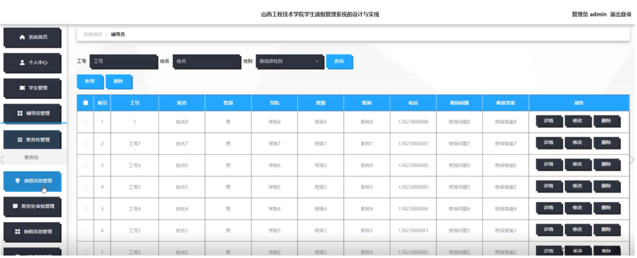 管理员点击辅导员管理;在辅导员管理页面输入工号、姓名、性别、学院、班级、职称、电话、密保问题、密保答案等信息,进行查询,新增或删除辅导员信息等操作;如图5-4所示。