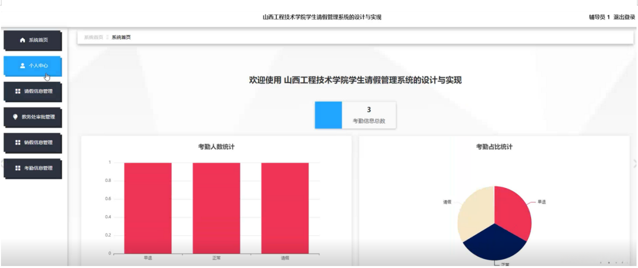 辅导员登录系统后,可以对系统首页、个人中心、请假信息管理、教务处审批管理、销假信息管理、考勤信息管理等功能进行相应操作,如图5-13所示。
