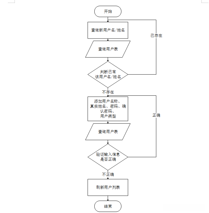 添加新用户的流程是先查询新用户名是否已存在,如已有该用户名,需重拟用户名并同时输入新用户的其它信息,添加新用户到数据库时会先验证数据是否完整,信息都正确且完整时,返回并刷新用户列表;信息不正确时,会返回输入信息的那一步。该流程如图3-6所示。