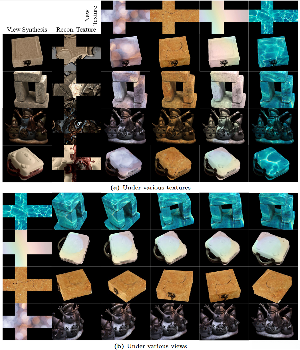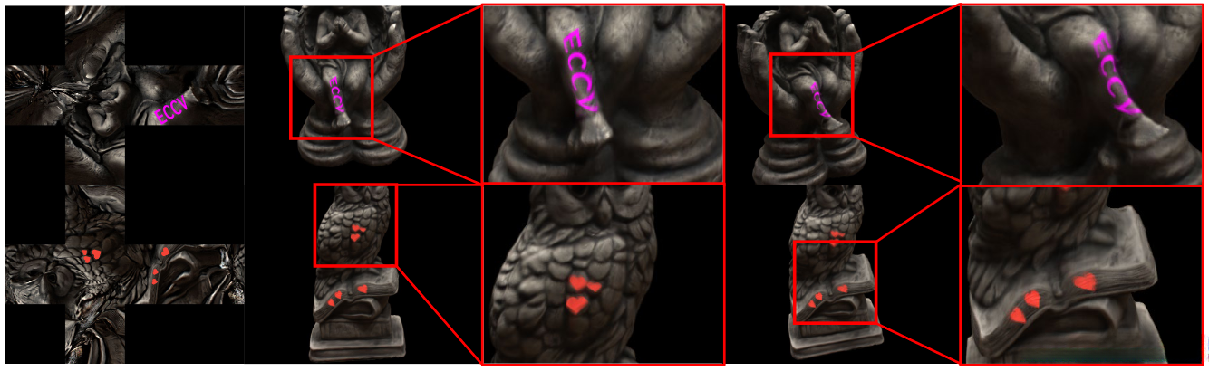 In addition, we define the texture space as a unit sphere , which is ill-suited to represent multiple objects or outdoor scenes. Representing the UV mapping with multiple charts(such as Nuvo), can address this problem, which is not the focus in this paper.