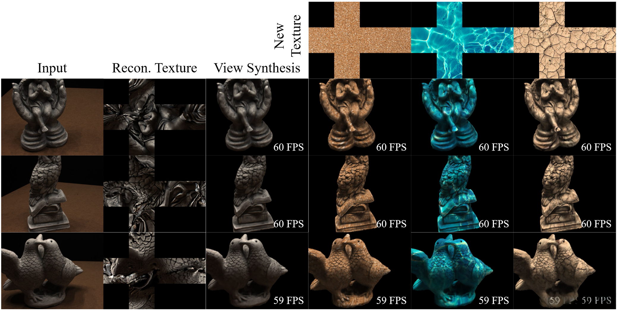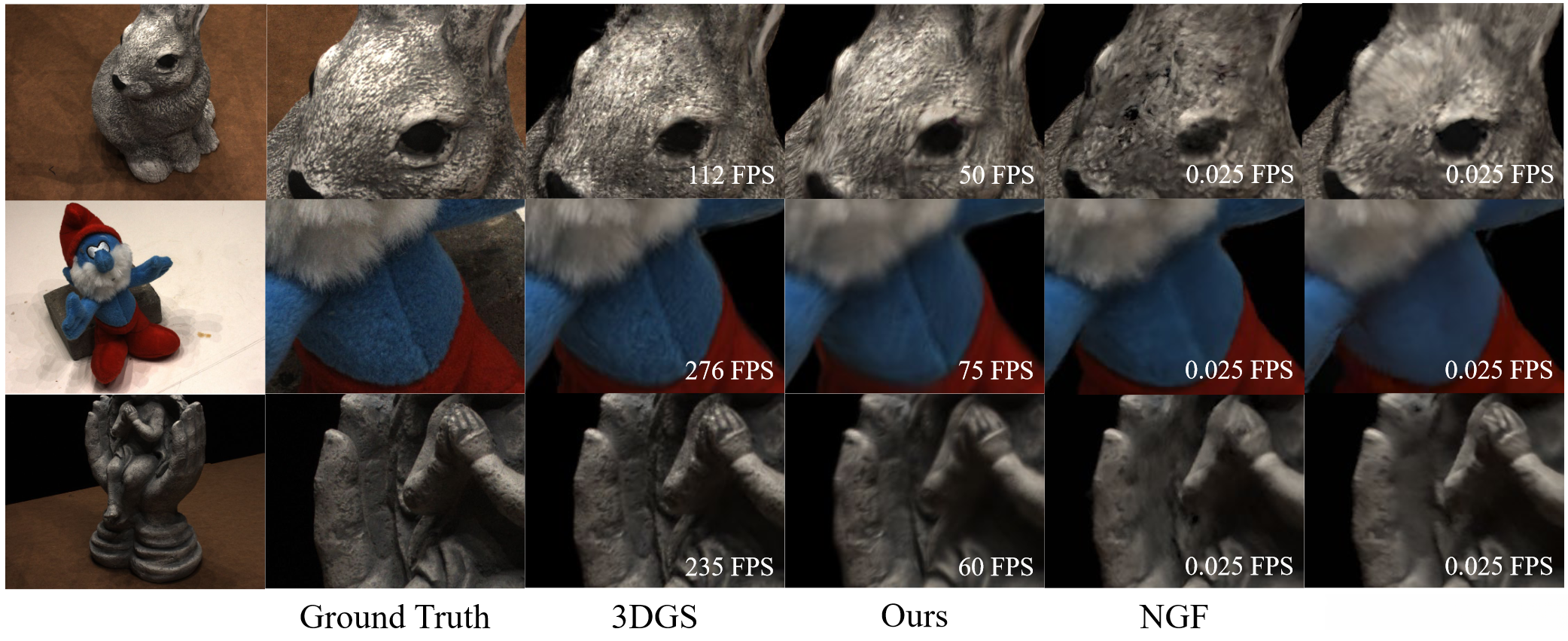 To achieve this, we incorporate atexture mapping module into 3DGS, which consists of a UV mapping MLP that projects 3D points into 2D UV space, **a local Taylor expansio n **for efficient UV mapping and a learnable 2D texture to capture the appearance of 3D scenes.