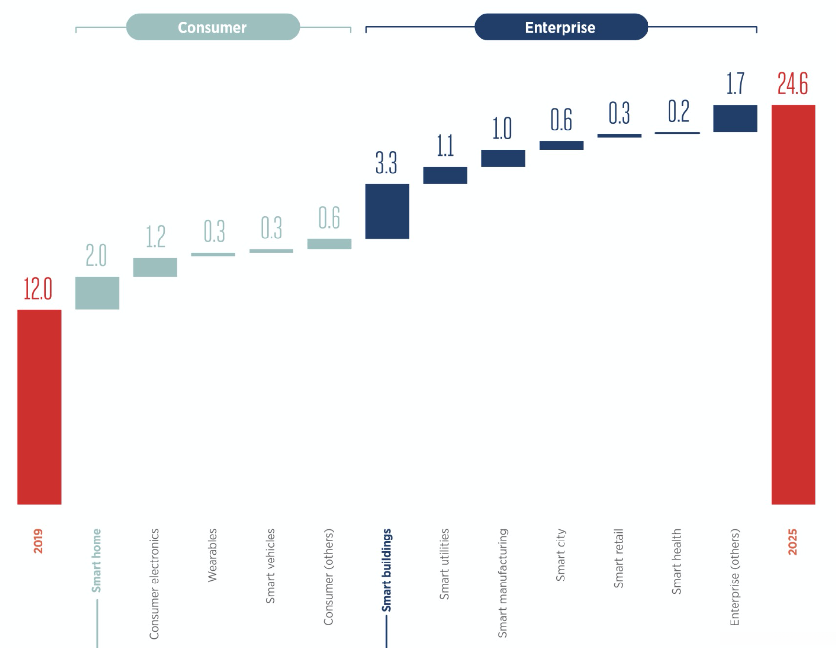 根据GSMA发布的《The mobile economy 2020》报告显示,2019年全球物联网总连接数达到120亿,预计到2025年,全球物联网总连接数将达到246亿,年复合增长率高达13%。其中智能家居和智能建筑增长最多,分别有20亿和33亿。产业物联网设备数量将超过消费物联网设备数量。