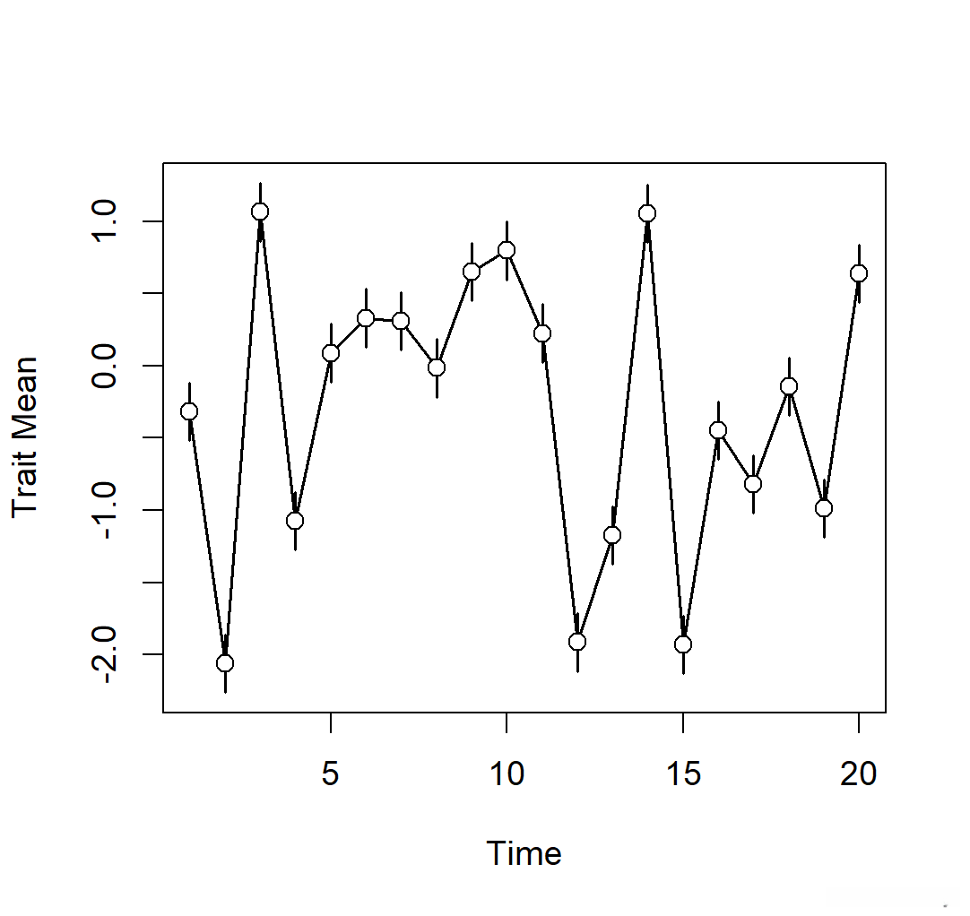 x <- as.paleoTS(mm = rnorm(20), vv = rep(1, 20), nn = rep(25, 20), tt=1:20)