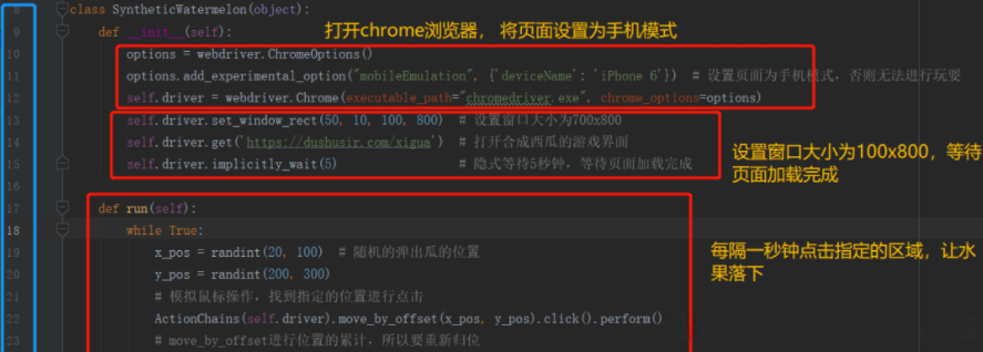 接下来程序将浏览器窗口大小设置为100x800 大小,让整个的游戏界面更加贴近手机的感觉,浏览器打开游戏的页面,然后隐式的等待5秒钟,等待页面加载完成。