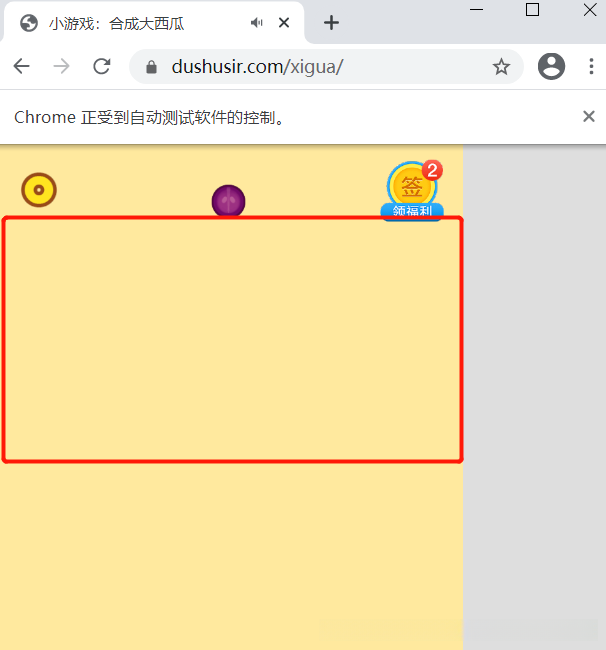 程序的22行就是模拟鼠标的点击动作,点击我们随机选择的位置。然后水果就会落下。同时在第24行中,我们需要将模拟的鼠标回归到初始的位置,因为move_by_offset 函数会在每次的位置移动时进行数值的累计,如果我们不回归到初始的位置,用不了几次,程序就会跳出上图中的红色区域,这样游戏也就无法继续下去。