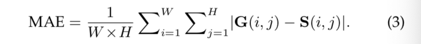 (3)平均绝对误差(MAE)指标:尽管这两个指标因其易用性和广泛性而备受关注,但它们未能有效识别真实负像素。该指标通过计算归一化映射S∈[0,1] W×H与地面真实值掩码G∈{0,1} W×H之间的平均像素方向绝对误差,有效地解决了上述问题。